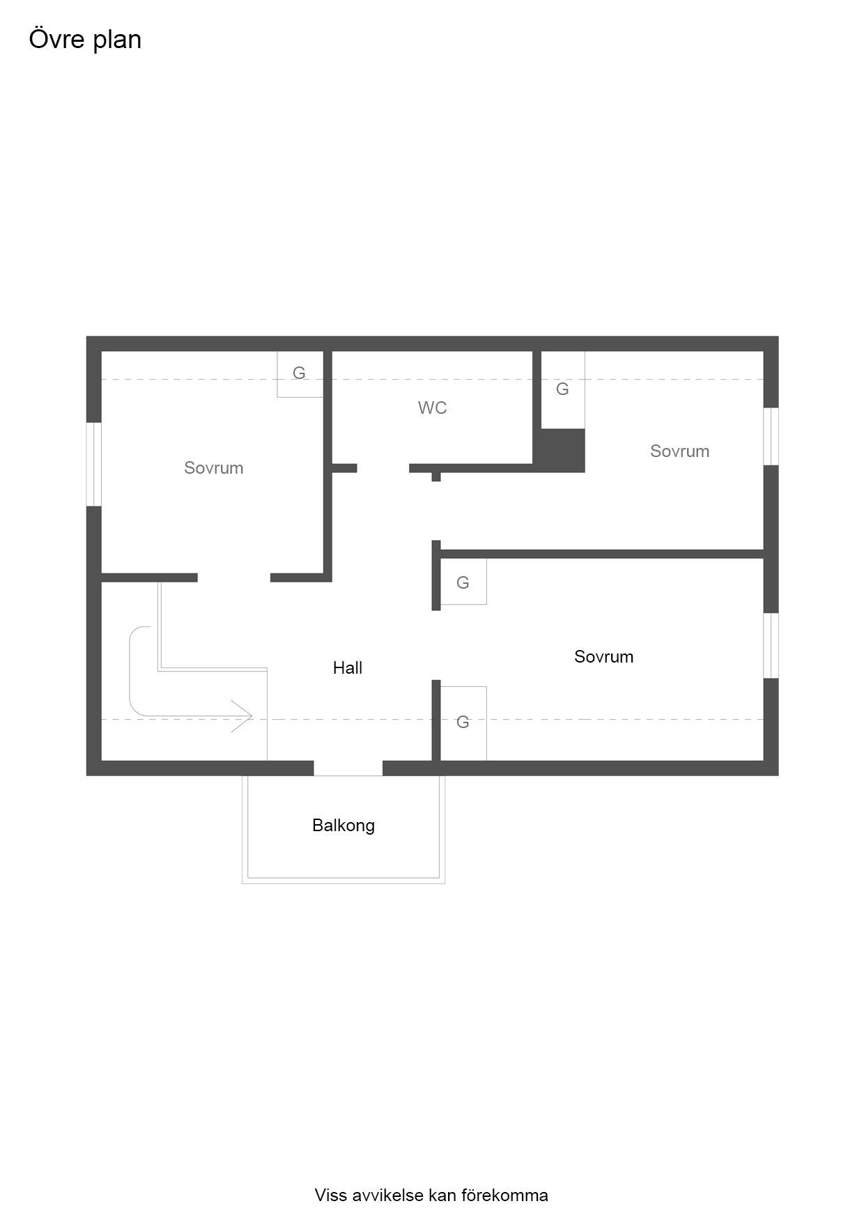 Övervåning: Hall med utgång till balkong och golvbeklädnad av trägolv. I hallen finns en frysbox.