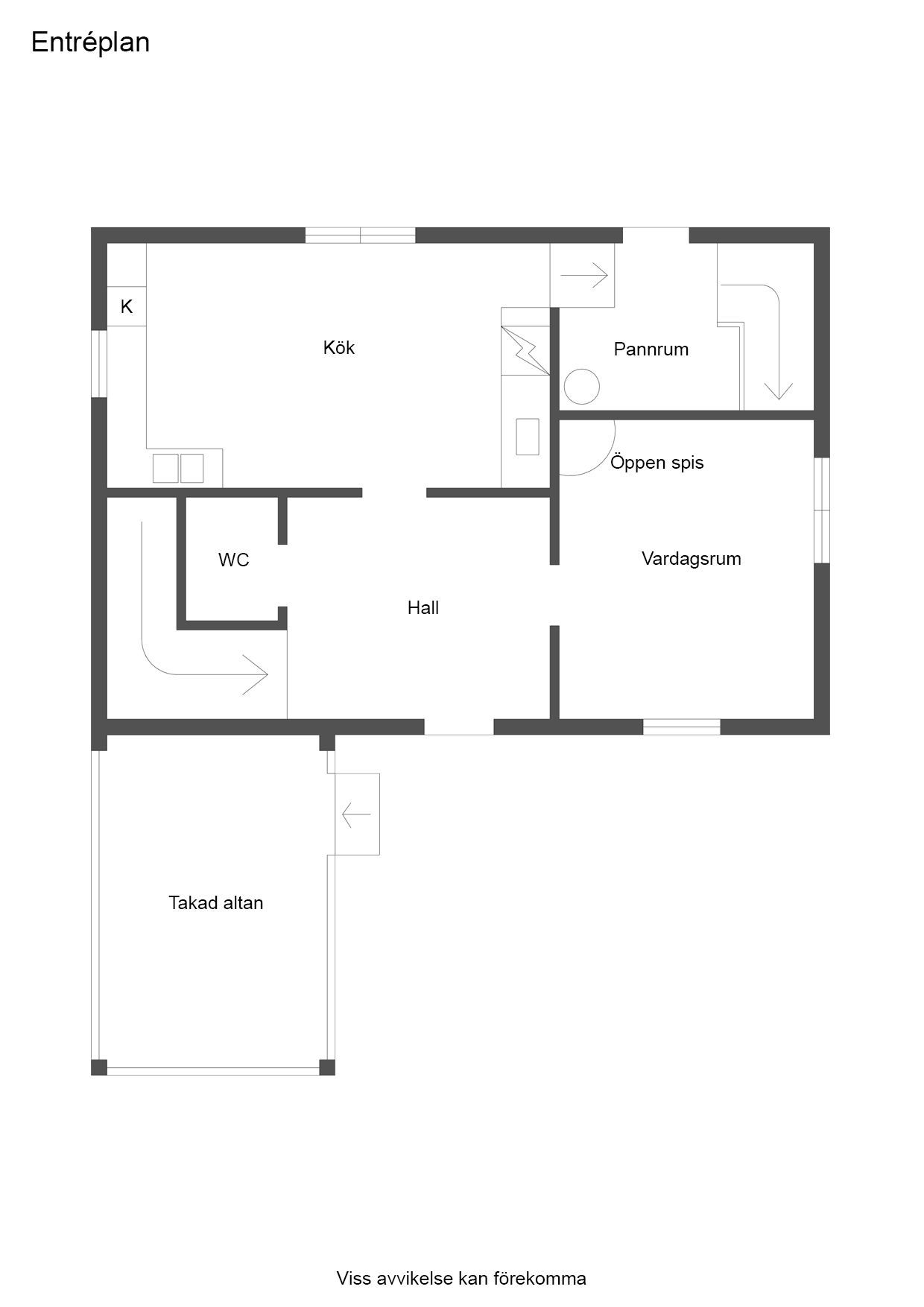Kök med gott om förvaringsytor samt spis/köksfläkt och kyl. Pannrum med utgång till markplan.